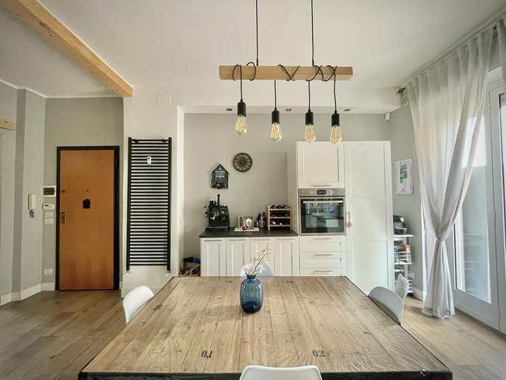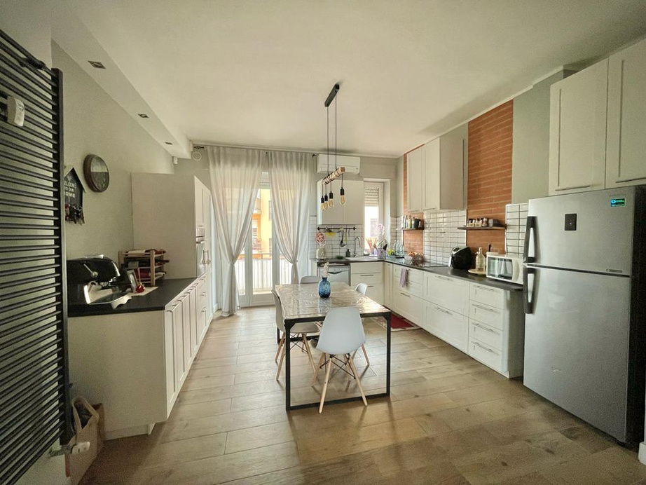 La cucina open space: completa di tutti gli elettrodomestici necessari e piano cottura a induzione. Il comfort è garantito dal condizionatore d'aria e un balcone che si affaccia sul tranquillo cortile interno.